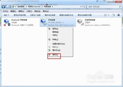 4、双击“本地连接”图标,在打开的“网络连接”窗口中双击“本地连接”“属性”图标。
