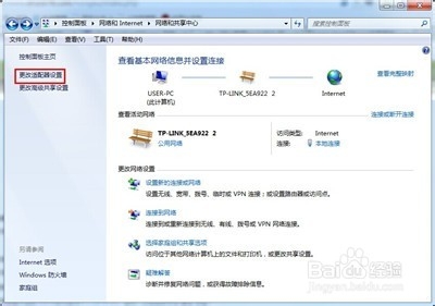3、更改适配器设置,在打开的“网络共享中心”窗口中单击左窗口的“更改适配器设置”超链接。
