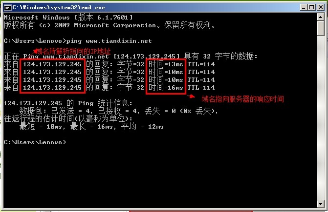 2、弹出cmd.exe程序以后,在黑色编辑器上输入PING+域名,然后回车,通过对该域名PING出来的IP地址,就是我们自己网站所在服务器的IP地址。如下图: